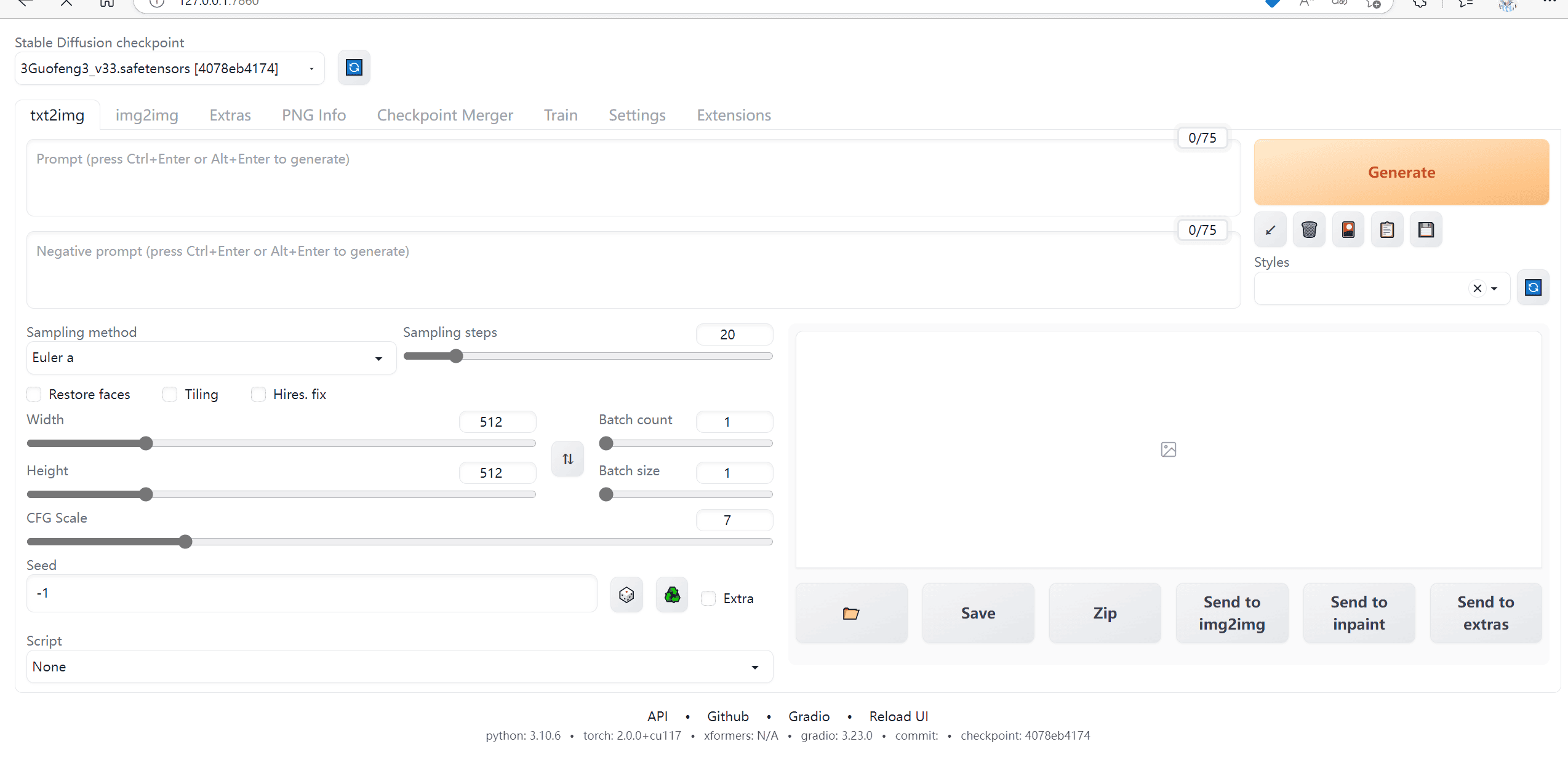 将地址127.0.0.1:7860填入浏览器并访问,便能访问自己搭建的ai绘图网站了。点击gernerate开始你的生成!