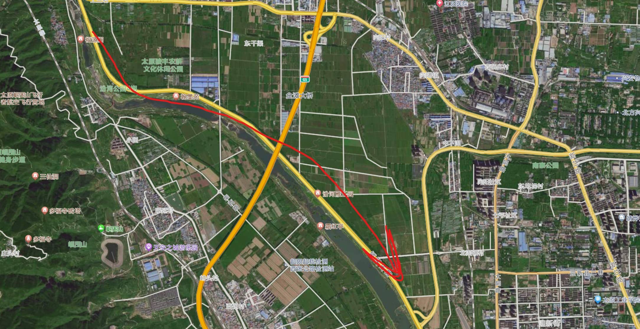 前些日子没事闲逛的时候,发现8道门出去往东一直走,有一条公路环境非常不错,没人没车,以后可以去那里跑步。至于骑车的话,我还是喜欢去汾河公园,沿着汾河一直往南(下游)。