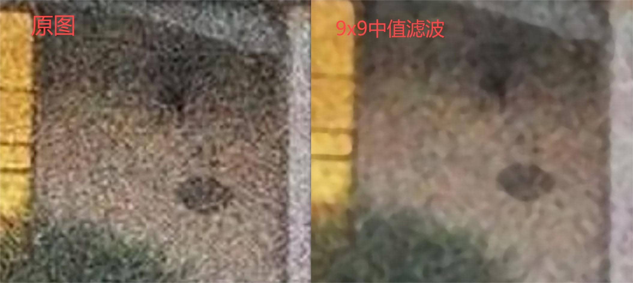 可以发现,3x3的中值滤波和原图几乎没有区别,将其改成9x9的中值滤波效果更加明显: