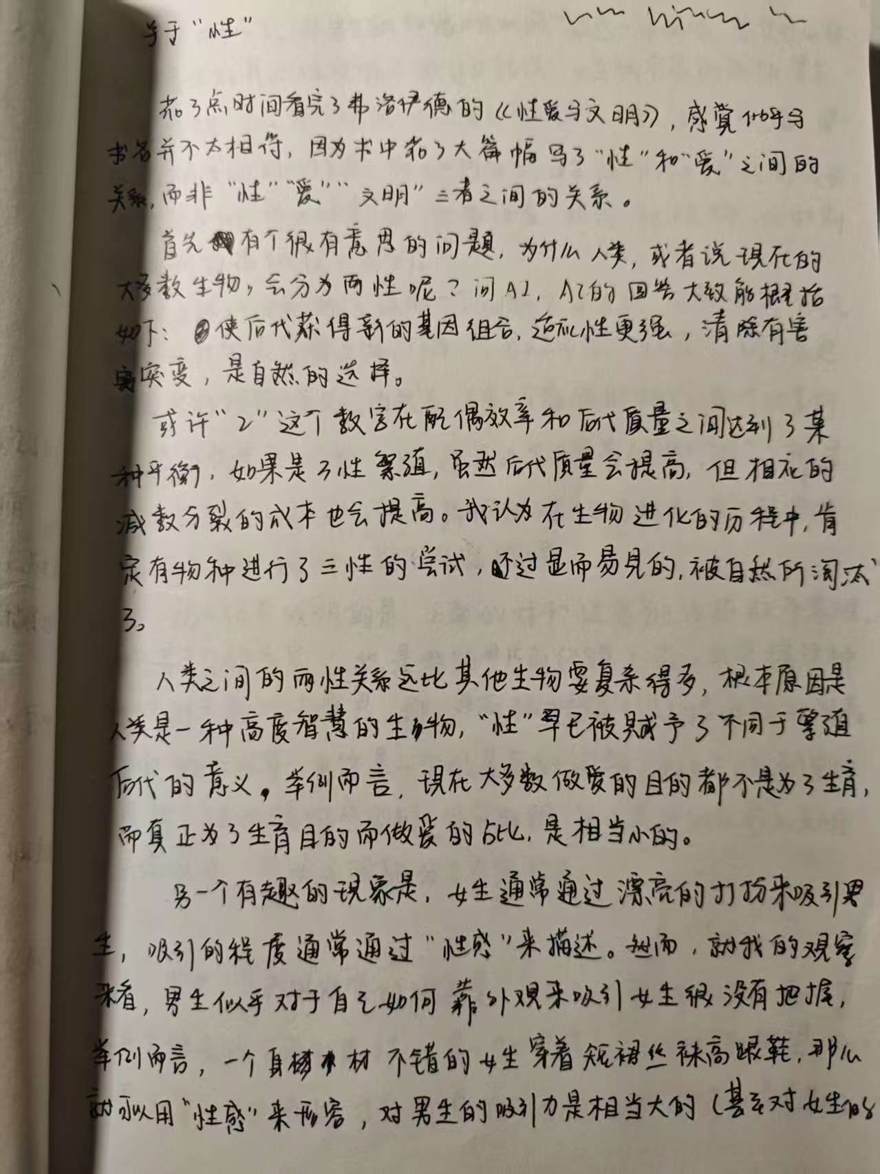“一般的说,我们的文明乃是根基于对本能的压制上的……”,人类之所以能称之为文明,很大程度上也体现在对性的压制上,我们制定某种规则不让性泛滥成灾。但一个有趣的问题是,性的本质是为繁殖后代服务的,而文明的首要任务是生存和发展(或者说扩张),从这个角度看,对性的压制似乎是文明发展的阻碍。