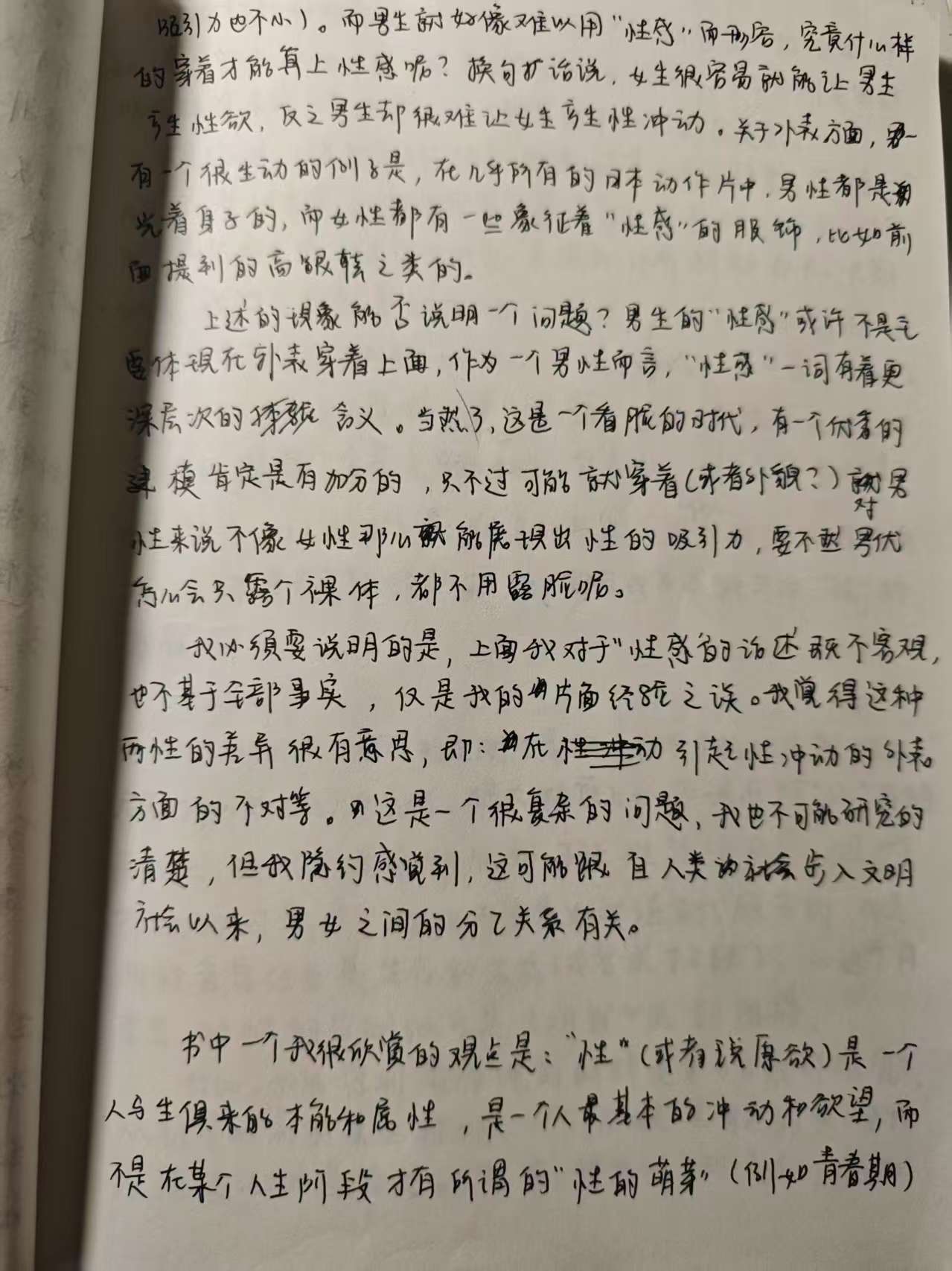 我必须要说明的是,上面我对于性感的论述既不客观,也不基于全部事实,仅是我的片面经验之谈。我觉得这种两性的差异很有意思,即在引起性冲动的外表方面的不对等,这是一个很复杂的问题,我也不可能研究得清楚,但我隐约感觉到,这可能跟自人类步入文明社会以来男女之间的分工有关系。
