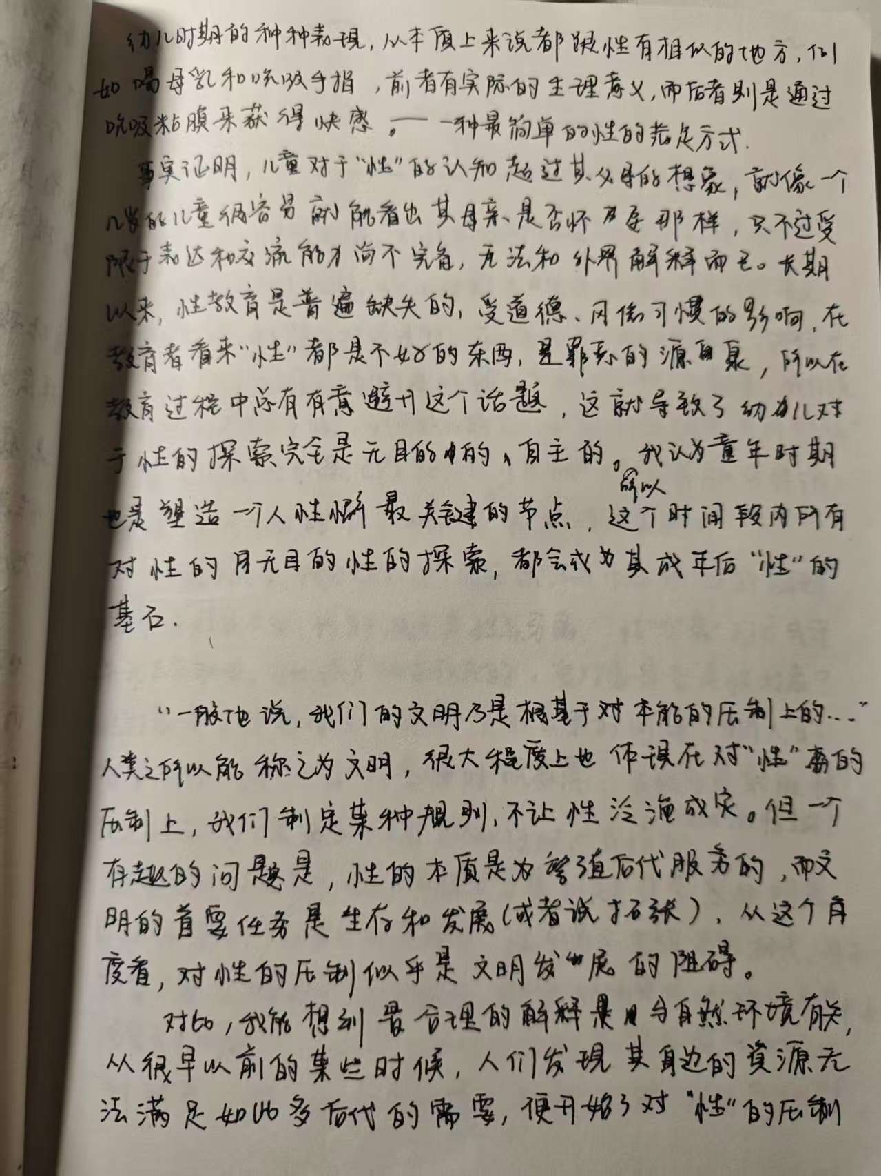 书中一个我很欣赏的观点是“性”(或者说原欲)是一个人与生俱来的本能和属性,是一个人最基本的冲动和欲望,而不是在某个人生阶段才有的所谓的性的萌芽,例如青春期。幼儿时期的种种表现从本质上来说都跟性有相似的地方,例如喝母乳和吮吸手指,前者有实际的生理意义,而后者则是通过吮吸黏膜来获得快感——一种最简单的性的满足方式。