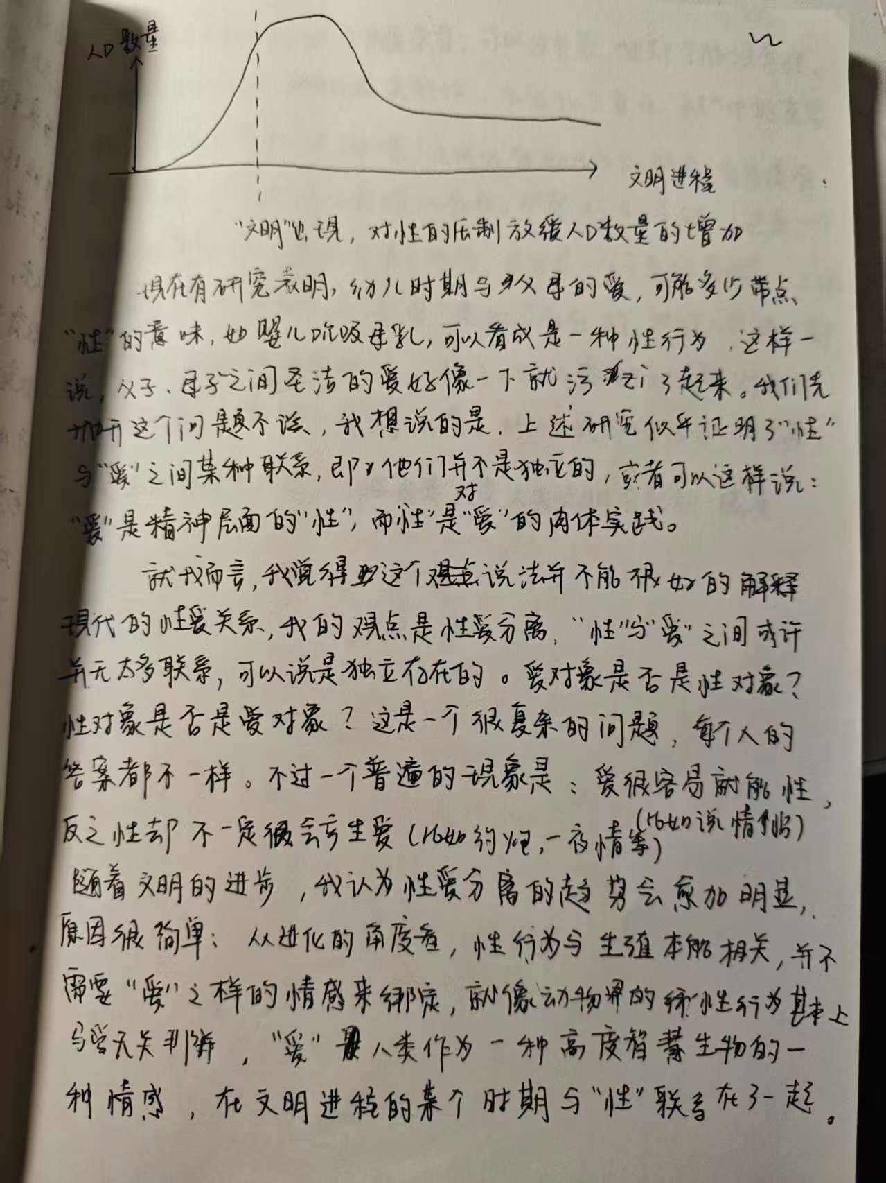 就我而言,我觉得这个观点并不能很好地解释现代的性爱关系,我的观点是性爱分离,性与爱之间或许并没有太多联系,可以说是独立存在的。爱对象是否是性对象?性对象是否是爱对象?这是一个很主观且复杂的问题,每个人的答案都不一样,不过一个普遍的现象是,爱很容易就能产生性(比如说情侣),反之性却不一定会产生爱(比如说一夜情)。随着文明的进步,我认为性爱分离的趋势会愈加明显。原因很简单,从进化的角度看,性行为与生殖本能相关,并不需要“爱”这样的高级情感来绑定,就像动物界的性行为基本上与爱无关那样。爱是人类作为高级智慧生物的一种情感,只不过在文明进程的某个时期与性联系在了一起而已。