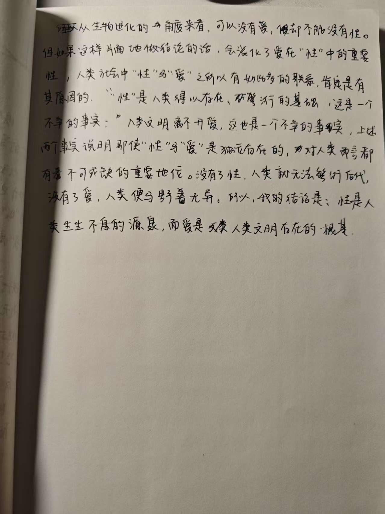 所以从生物进化的角度来说,可以没有爱,却不能没有性。但如果这样片面的做结论的话,会淡化了“爱”在“性”中的重要性,人类社会中性与爱之所以有如此多的联系,肯定是有其原因的。性是人类得以存在和繁衍后代的基础,这是一个不争的事实;人类文明离不开爱,这也是一个不争的事实;上述两个事实说明,即使性与爱是独立存在的,对人类而言都有着不可或缺的重要地位。没有了性,人类就无法繁衍后代;没有了爱,人类便与野兽无异。至此,我的结论是:性是人类生生不息的源泉,而爱则是人类文明存在的根基